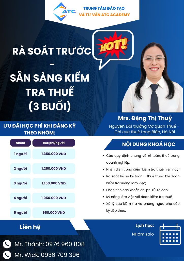 Khóa học “Rà soát trước – Sẵn sàng kiểm tra thuế” do ATC Academy tổ chức là chương trình đào tạo chuyên sâu kéo dài 3 buổi, tập trung vào việc chuẩn bị tâm thế và hồ sơ quyết toán thuế cho doanh nghiệp.